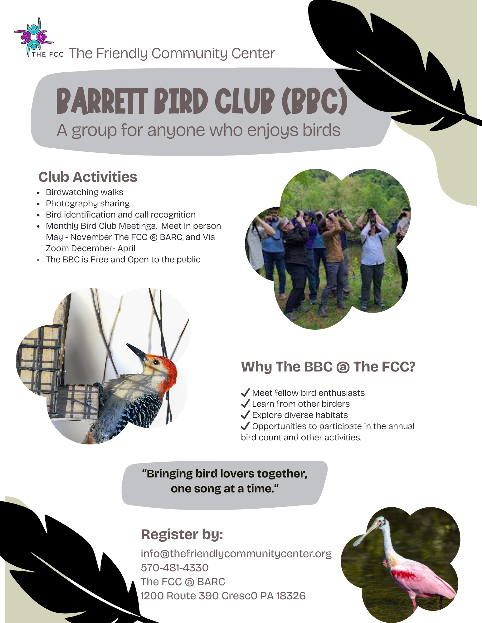 If you enjoy birds, join for monthly meetings of the BBC at The FCC. Meetings will include informational programs, discussion of birds and seasonal birding opportunities, including walks and other birding activities throughout the year.